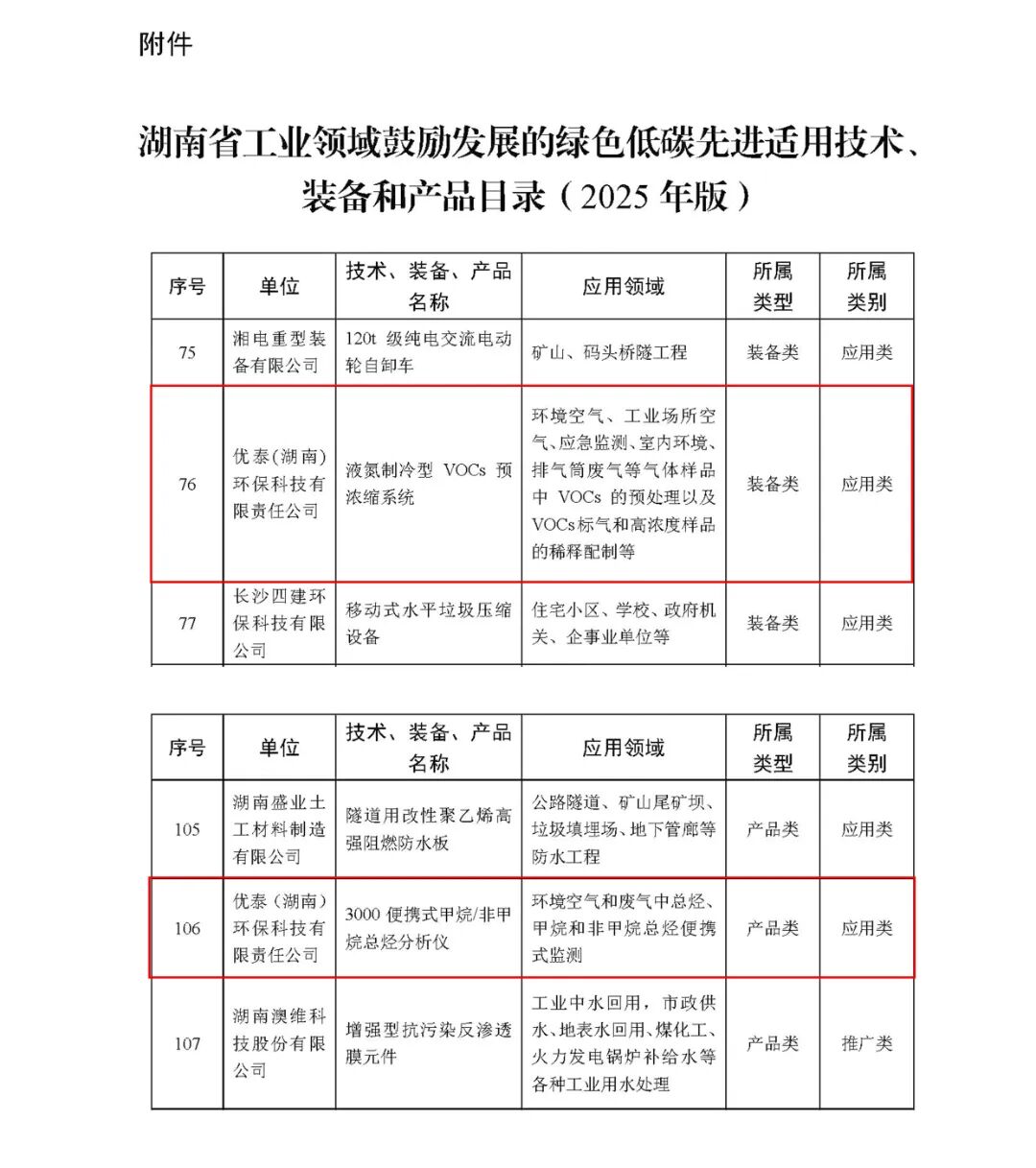 近日,湖南省工业和信息化厅正式发布《湖南省工业领域鼓励发展的绿色低碳先进适用技术、装备和产品目录(2025年版)》,优泰(湖南)环保科技有限责任公司(以下简称“优泰科技”)自主研发的"液氮制冷型VOCs预浓缩系统"和"3000便携式甲烷/非甲烷总烃分析仪"双双入选,彰显了企业在环保监测领域的技术实力。