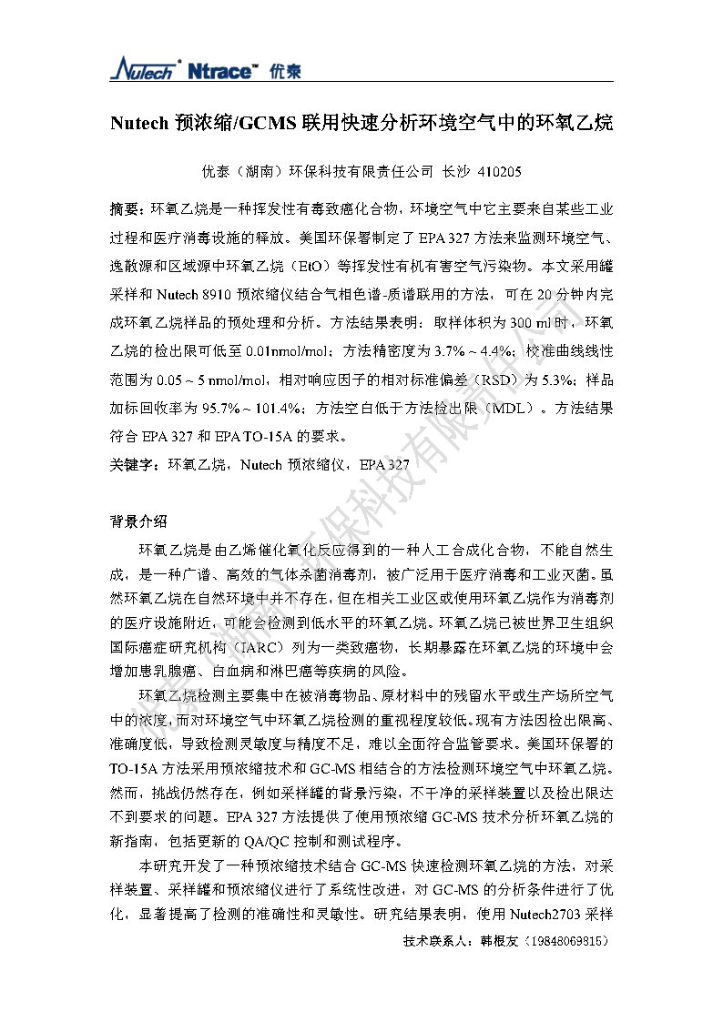 Nutech预浓缩/GCMS联用快速分析环境空气中的环氧乙烷